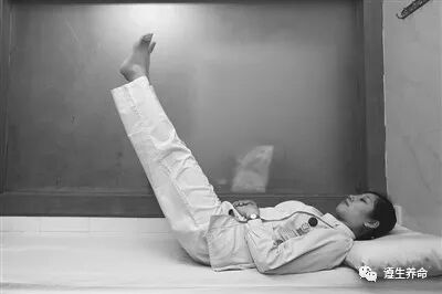 动作要领:平躺于床上,注意床垫不可太软。双手叠放在丹田,双腿并拢。双腿抬起向天花板,大腿保持不动片刻。随后小腿下垂,与大腿成90度,脚底朝向墙面,保持此动作15~20秒,重复进行3~5次。