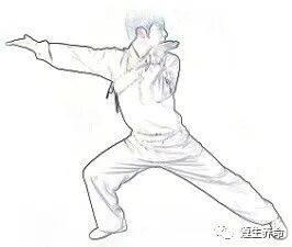 (4)左手推颈左转的同时,右手转掌向上,右膝屈曲,成侧弓步。