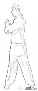 (1)松拳转手,手掌向前,上肢侧举,膝随手直。