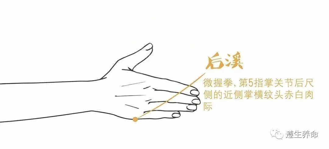 后溪穴怎么找呢?把手握成拳,在第5指关节后的远侧掌横纹头赤白肉际处即是(即把手握拳,掌指关节后横纹的尽头就是该穴)。