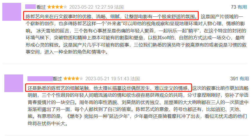 如果说《少年的你》能看到少年之间的救赎,与命运不公的顽抗,那么《燃冬》只让我看到了青年的颓靡,他们在迷茫的时候没有向人生发出疑问或寻求新的答案,反而与认识没几天的陌生人发生莫名其妙的关系,这,难道不是自我放弃吗?