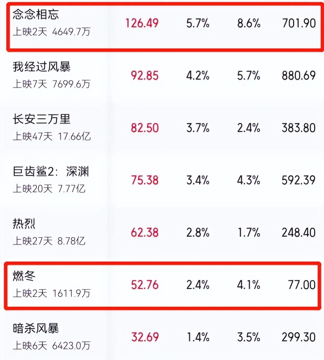 可毕竟刘浩存和宋威龙咖位本就一般,让人最意外的是有三金影后周冬雨坐镇的《燃冬》竟然不见踪影,往下一拉才发现甚至还不如《巨齿鲨2》和家暴题材《我经过风暴》,让人笑掉大牙。