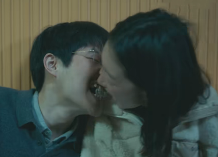 对,你没看错,如此炸裂的情节甚至还要放在宣传预告,三个人喝美了,笑嘻嘻靠在一起,浩丰把冰块给娜娜,然后娜娜把冰块吐出来到韩萧嘴里。