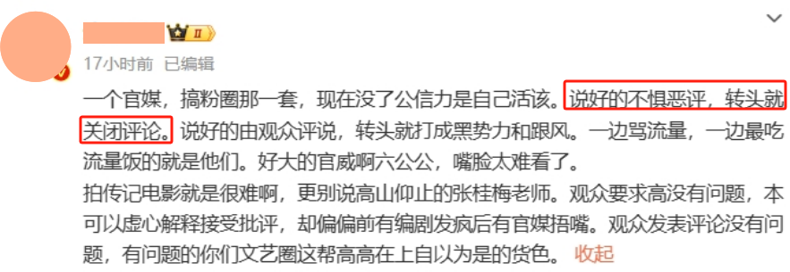 声称“你奶奶我生来就是高山”和直接问候网友父亲的编剧美美隐身,倒是把不服的大V挂出来了,真不知道谁是恶评。