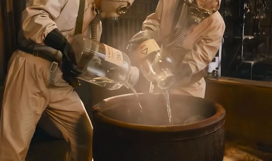 镜头一转,尸体被折叠放进大缸里,两大瓶硝酸直接倾倒而下,尸骨瞬间蒸发,声音极其刺耳。