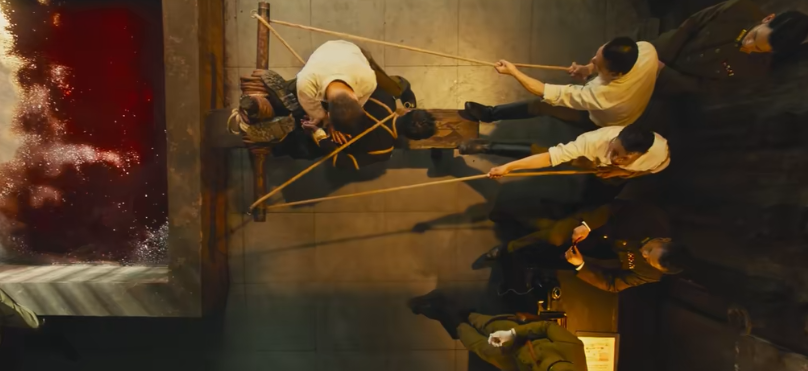 反特处处长李士武被套上麻袋,直接被强制上吊,当他挣扎没有气息后,身体开始排出污秽之物,声音蔓延整个影厅。
