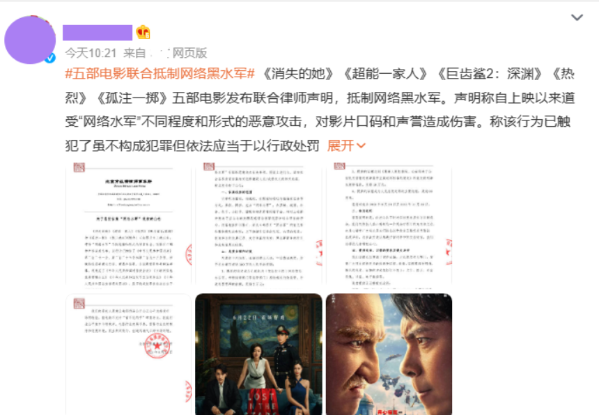 《燃冬》和《念念不忘》相继扑街时,暑期档热映的电影其实还在紧追慢赶之中。《孤注一掷》已经突破了30亿票房,而《封神第一部》导演女主黑料被讨论得沸沸扬扬,另一边五家电影又开始联合“反黑”。
