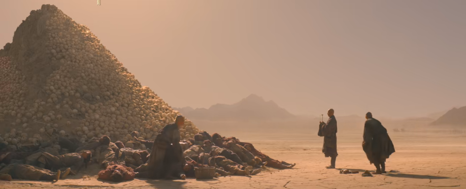 一眼望不到头的荒漠,几个和尚、一堆尸体,还有头颅堆成的山。迷雾中隐约可见的宫殿建筑,神秘气息扑面而来,在梦幻之中将悬疑感拉满。