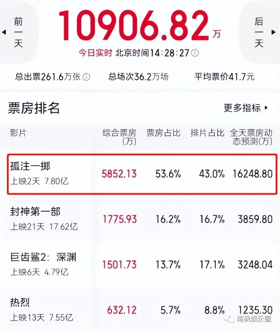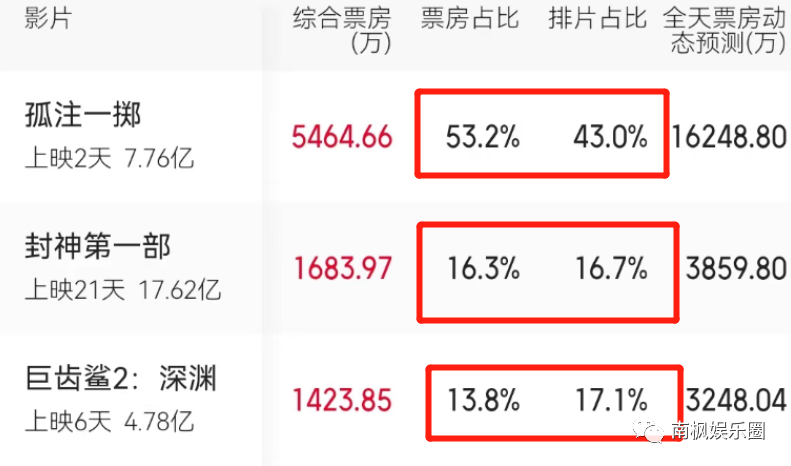 《孤注一掷》排片43%,《巨齿鲨2》与《封神第一部》在17%左右,确实是另外两部电影的一半。