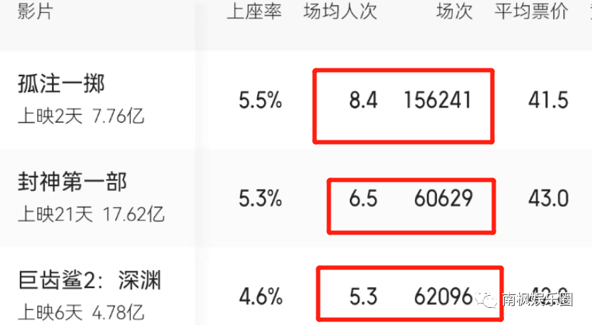 《巨齿鲨2》六万场上座率4.6%是三部里最少的,《封神第一部》也六万场,场均人次6.5。