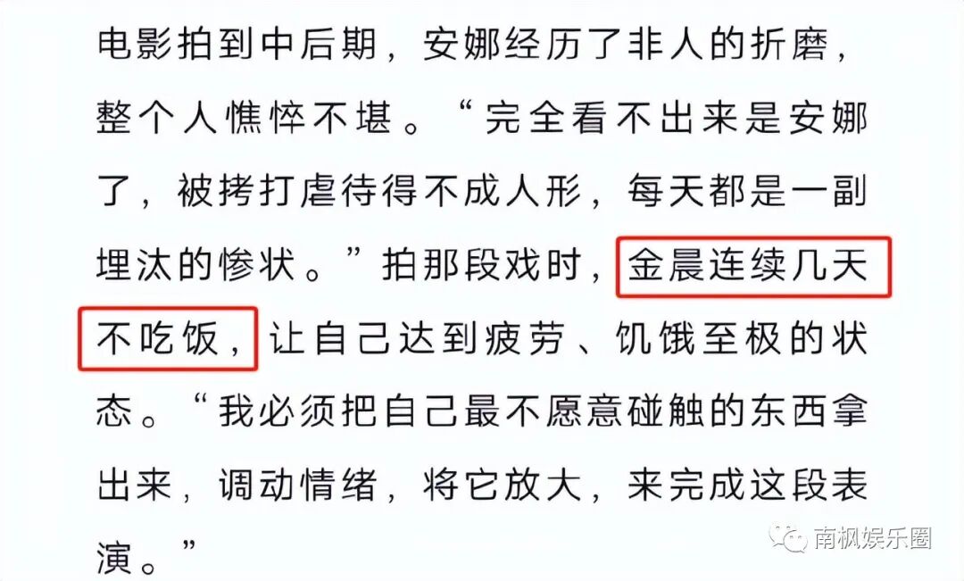 在谈到第一次演荷官这件事时,金晨表示为了诠释出安娜后期的憔悴不堪、被拷打虐待得不成人形,她甚至连续几天不吃饭,力求达到那种饥饿疲惫至极的状态。