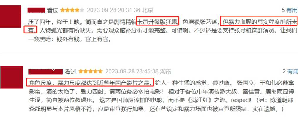 “卡司升级版狂飙,暴力血腥的写实程度前所未有”、“角色尺度,暴力尺度能达到这两年国产片之最”。
