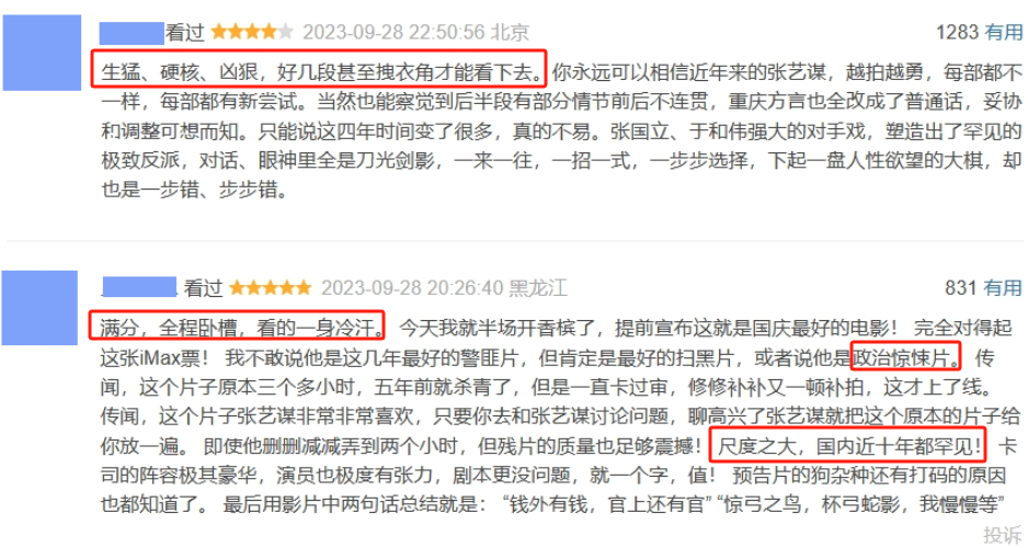 “生猛,硬核,凶狠,甚至要拽着衣角才能看下去”,“满分,全程‘卧槽’,看得一身冷汗”、“尺度之大,国内近十年罕见!”。
