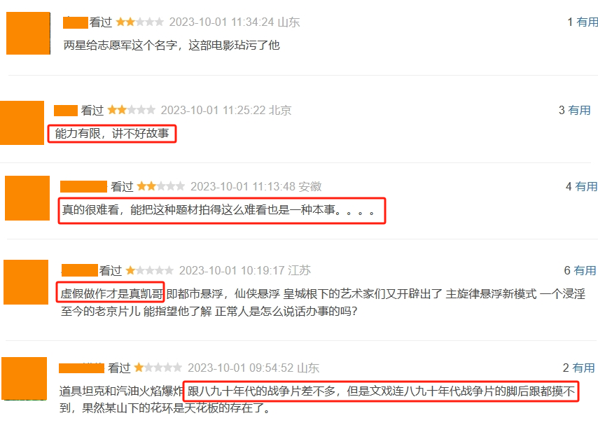 “真的很难看”、“之后在那个题材拍这么难看也是本事”、“能力有限讲不好故事”、“虚假做作”、“特效八九十年代战争片既视感,但文戏连其后脚跟都摸不着”。