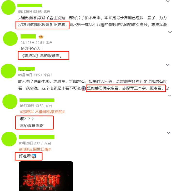 而且是一碗水端平的那种:“本来觉得《长津湖》就挺一般了,没想到这部比《长津湖》还难看”、“《坚如磐石》难看,《志愿军》更难看。”