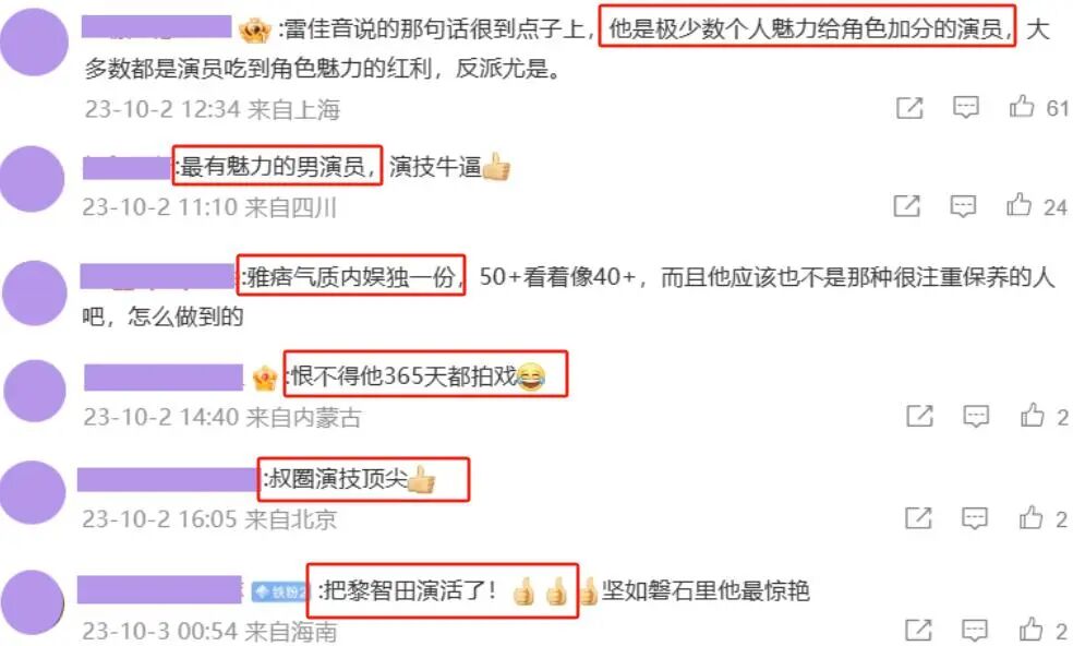 “最有魅力的男演员”、“雅痞气质内娱独一份”、“叔圈演技顶尖”、“恨不得他365天都拍戏”。