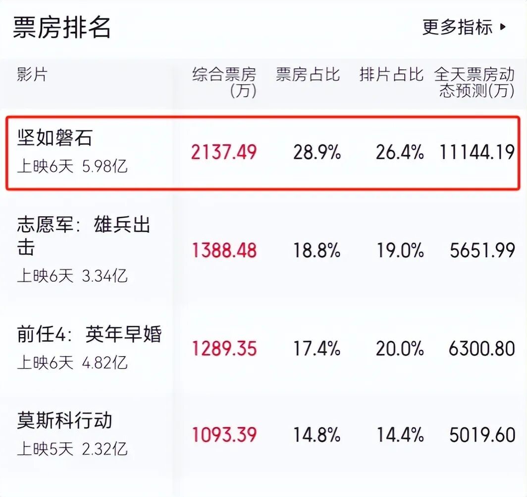 《坚如磐石》上映6天,至少6亿票房打底,在这个大部分观众都出去游玩的小长假,其他电影再咋呼也没用,还有谁敢不服?