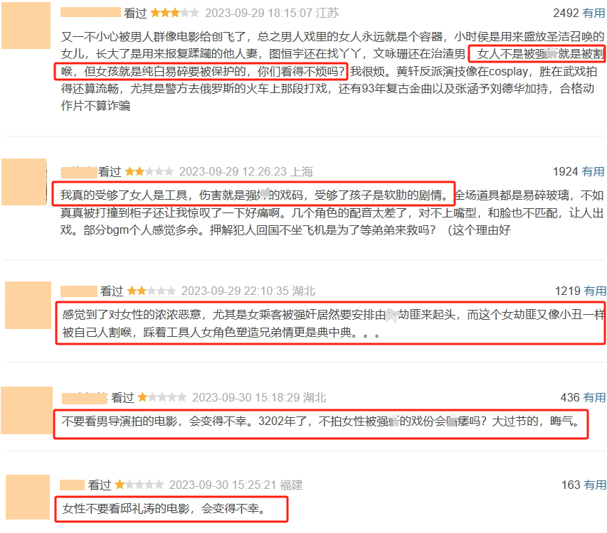 “女性不要看邱礼涛的电影,会变得不幸”、“不要看男导演拍的电影,会变得不幸”、“女人不是被强就是被割喉、看得不烦吗”、“受够了女人是工具”等等。