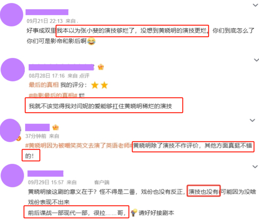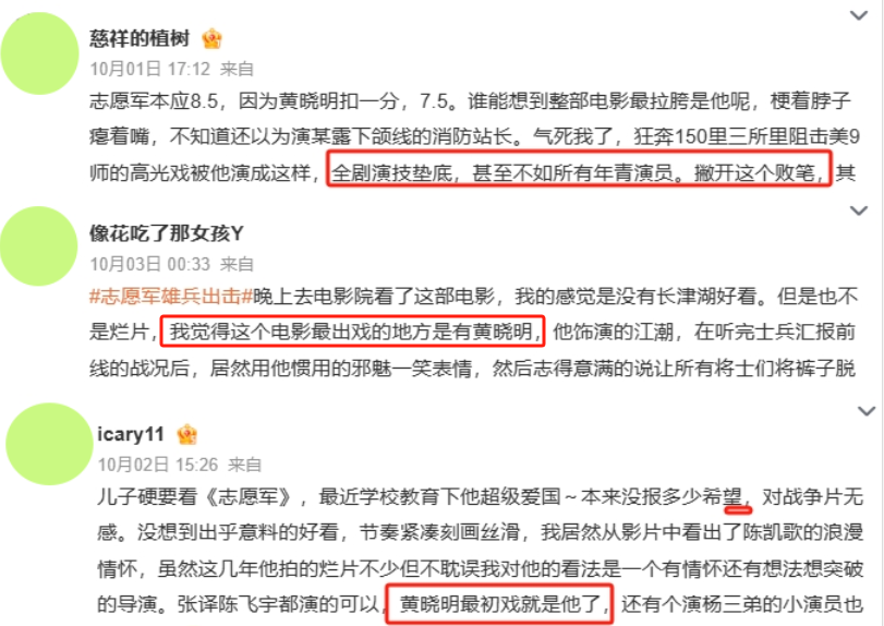 “败笔,演技垫底,甚至不如所有年轻演员”、“最出戏的就是黄晓明”等等。