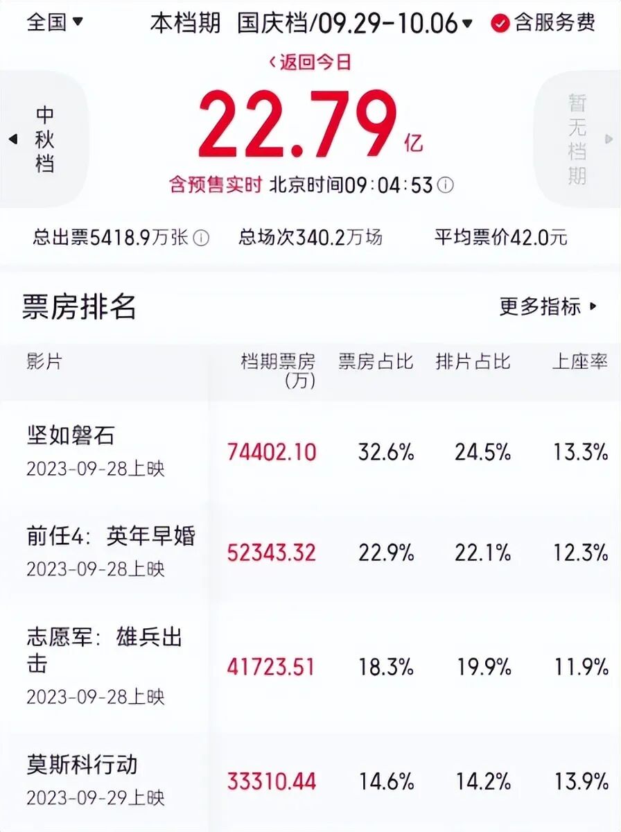 7天,票房大盘近23亿,其中突出重围的,还得是《坚如磐石》,别说口碑怎么样,反正各个黄金档期,老谋子绝对是领跑般的存在。