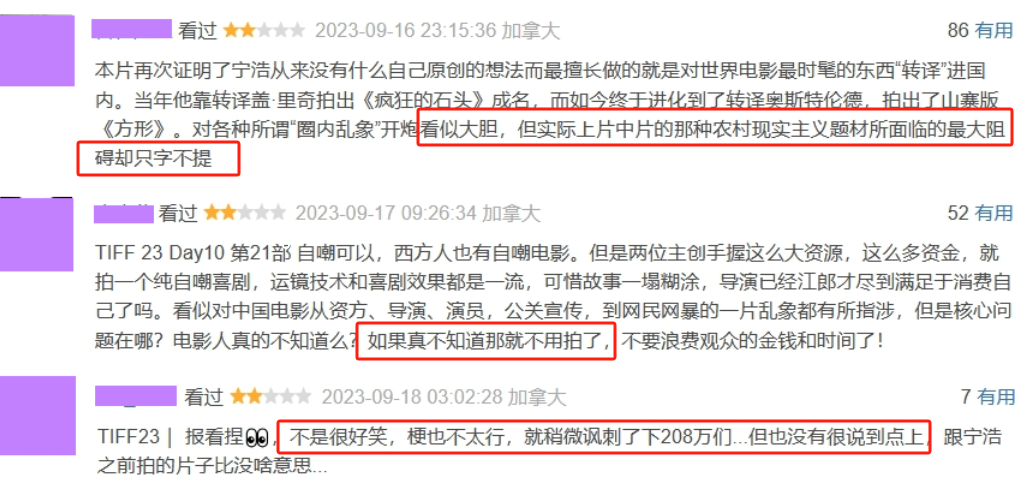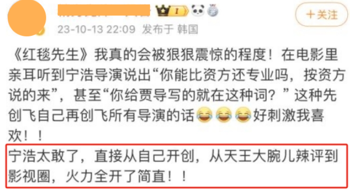 “宁式自嘲喜剧、极简美学,现场观众直接大笑”、“宁浩太敢了,直接从自己开‘创’,简直火力全开”。