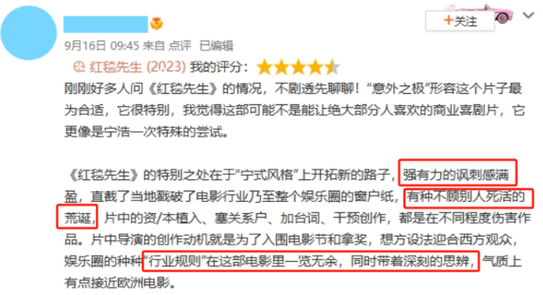 《红毯先生》的好评非常多,而且大部分为长文分析,从字句中能够看出观众还未平息的激动情绪。