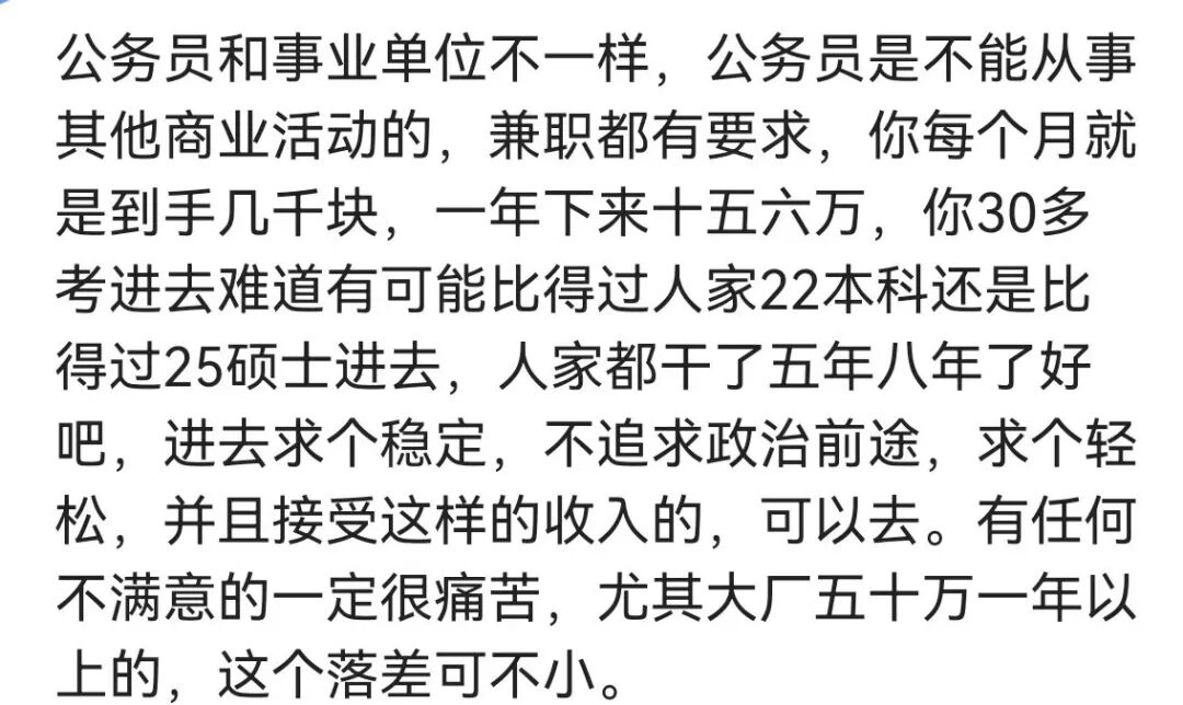 可是,程序员考公务员,不就是为了轻松稳定吗?在互联网已经挣了几年快钱了,手里有了一两百万存款,然后选择安稳。总结起来就一句话,35岁之前互联网捞钱,35岁后体制内养生。