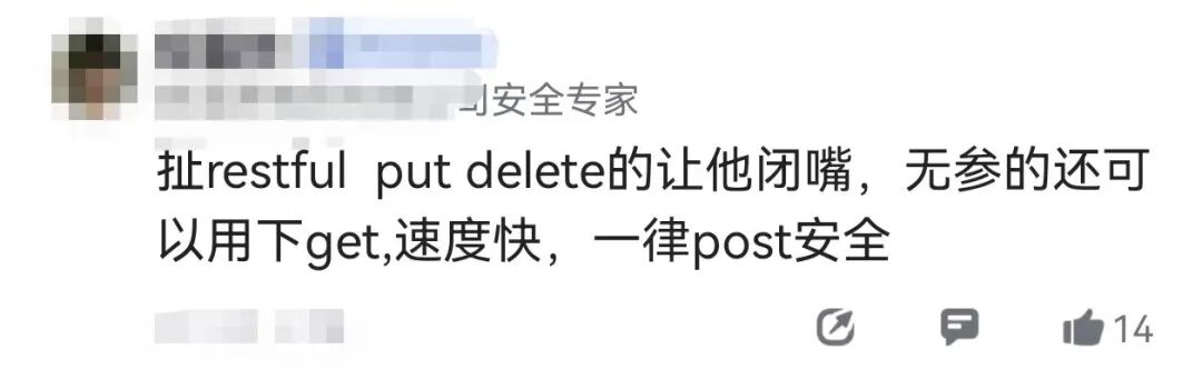 更有人举例进行了说明,假如写了两个接口,一个put,一个post,相同的业务逻辑,post不做任何参数校验,而put方法中做参数校验,请问哪个更安全?他认为那些说put和delete没有post安全的人,都是面试八股文背傻了的人。