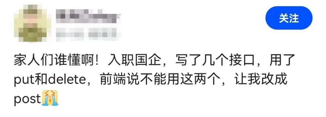 某程序员入职国企,开发接口时,根据接口的功能,分别使用了put和delete类型,没有想到前端开发看到后,直接让他统一改成post。
