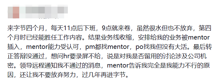 但一位网友,在字节实习了4个月,每天都很卷,从9点卷到11点,终于在第4个月的时候可以胜任工作了,却因为业务线紧缩,自己原先负责的业务被mentor接收,mentor得到领导的认可,而自己最终因为工作内容不足,没能通过转正答辩。