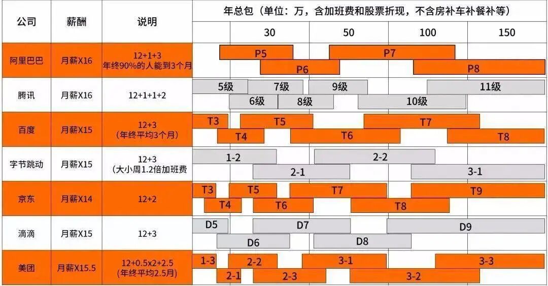 当然,在不同的公司,月薪50K所对应的岗位也不同,比如在小公司,基本是领导层了,而在互联网大厂,只够资深开发和初级领导。下面是各互联网大厂薪资级别表: