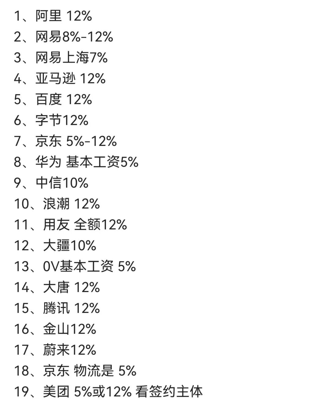 互联网公司中通常比例在5%-12%之间,国企会更多。一线互联网公司,公积金比例也各不相同,来看看各家的比例吧: