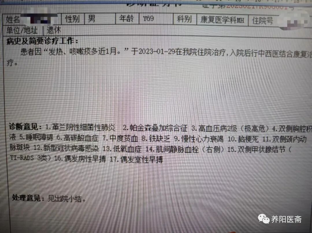 过完年后,病人病情稳定,安排转到我们科住院康复。住进我们科后主要是中药为主,辅助氧疗,配合吞咽训练以及呼吸功能锻炼。