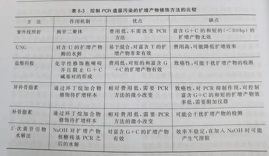 处理方法:那如何快速的清除由扩增产物引起的实验室污染呢?在《实时荧光 PCR 技术》(第二版)中给出了如下图所示的扩增产物解决办法,并对各种方法的优缺点进行了阐明: