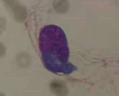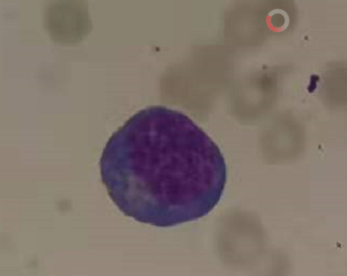 在涂片的边缘我们发现了 2 个这样的细胞,经过仔细观察细胞胞体较大,胞浆深染,细胞核染色质比较细致,隐约可见核仁,我们初步报告为原幼细胞,结合临床建议进一步行检查。