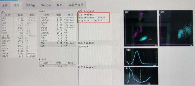 可是你仔细看看仪器的报警信息,你肯定会吓一跳。不仅 RBC Flag(s)区报了 Anemia (贫血);WBC Flag(s)还报了「IG Present(幼稚粒细胞增加),Blasts/Abn Lympho?(原始细胞 / 异常淋巴细胞) ,Atypical Lympho?(异型淋巴细胞) ;而且 WDF 通道的散点图也出现异常,如下图: