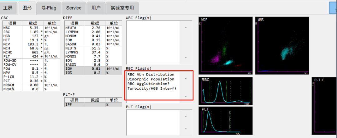 首先看 RBC 与 HGB 的比例关系(一般二者是 30 倍左右的关系,即 RBC 计数 ×30=HGB(g/L)),如果 RBC 和 HGB 不成比例,且 MCHC > 380g/L 时,高度怀疑冷凝集或者样本乳糜血,如图,患者为冷凝集: