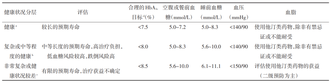 表 1 根据健康状况分层的老年糖尿病患者的血糖、血压、血脂治疗建议