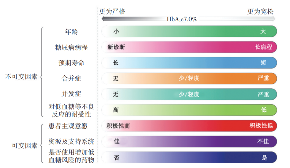 对于预期寿命较长、无并发症、未合并心血管疾病的 T2DM 患者在无低血糖或其他不良反应的情况下可采取更严格的 HbA1c 控制目标(尽量接近正常)。年龄较大、病程较长、有严重低血糖史、预期寿命较短、有显著的微血管或大血管并发症或严重合并症的患者可采取相对宽松的 HbA1c 目标。