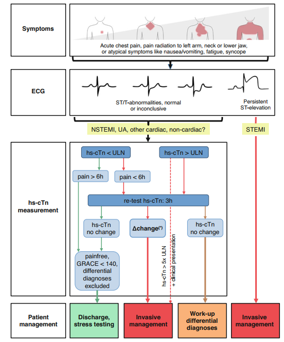 图 3 基于心电图结果和使用 hs-cTn 的 0 h/3 h 算法对疑似 AMI 患者诊断分诊和治疗策略指南