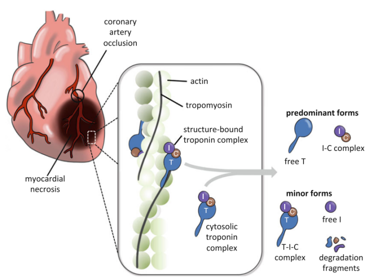 图 1 心肌组织中的肌钙蛋白复合物以及主要和次要 cTn 形式从心脏坏死细胞释放的示意图