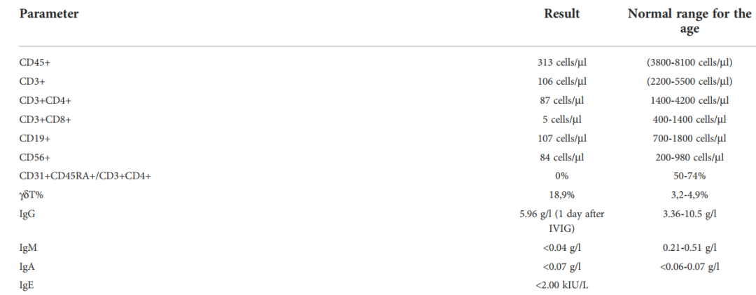由于病情较重且合并免疫缺陷的免疫学特征,患儿接受了造血干细胞移植(HSCT),2 个月后,CD4 + 和 CD8+ T 细胞计数稳定在 200 个 /mL 以上。两年后随访:患儿的身体和运动发育稍有迟缓,但 B 细胞淋巴细胞减少是永久性的,患者需要人免疫球蛋白治疗,简短输注红细胞。