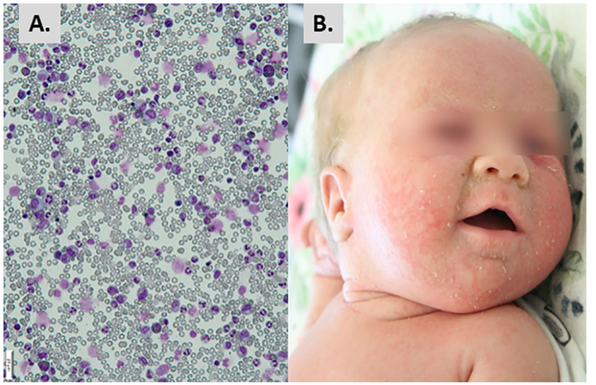 患儿在 32d 时从新生儿病房出院,但一周后,她因贫血(Hb 7.3 G/L)和淋巴细胞减少(0.7x109/L)再次入院,并伴有红斑丘疹,表现为全身性红斑、小叶性皮肤疹,主要位于面部,且已排除维生素 B12 和叶酸缺乏症。