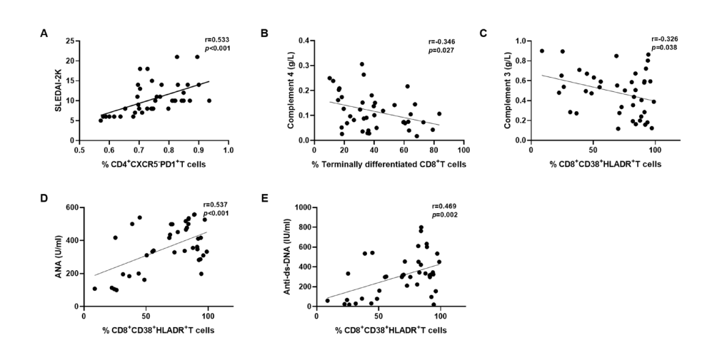 1)补体 C3、C4 明显降低表明 SLE 有活动性,研究中 CD8+ T 细胞与 C4 水平呈负相关(r= - 0.346, p=0.027),CD8+CD38+HLA-DR+ T 细胞与 C3 水平呈负相关(r= - 0.326, p=0.038)(图 5B 和 5C)。