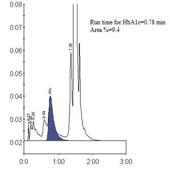 目前实验室应用最广泛 HbA1c 检测方法是离子交换高效液相色谱法(HPLC),其方法操作方便、结果准确、快速,但此方法易受血红蛋白变异体的干扰。HPLC 的原理是根据 HbA1c 所带电荷与其他蛋白之间的差异而将其分离,再根据峰值下面积来计算 HbA1c 占总 HbA 的比例(图 1)。