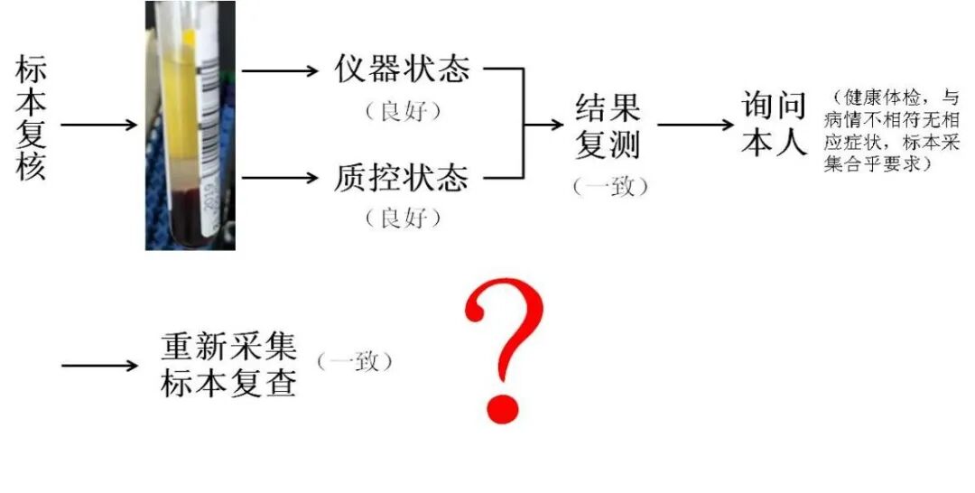 虽然血糖仪检测指尖血血糖含量与静脉血血糖含量有一定的误差,但是结果不应该差别如此大,难不成是血糖仪坏了?出于对患者负责的态度,我们将其结果按着我实验室制定的「实验室异常结果处理流程图」(如图 2)进行复核。