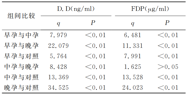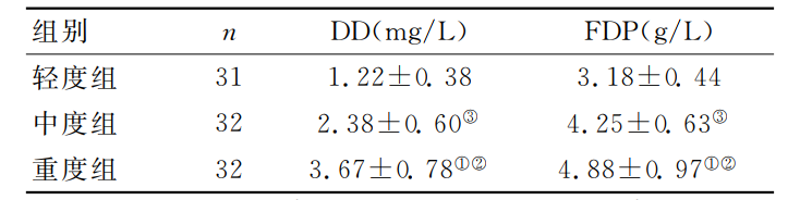 表 3 各组间 D-二聚体和 FDP 水平两两比较