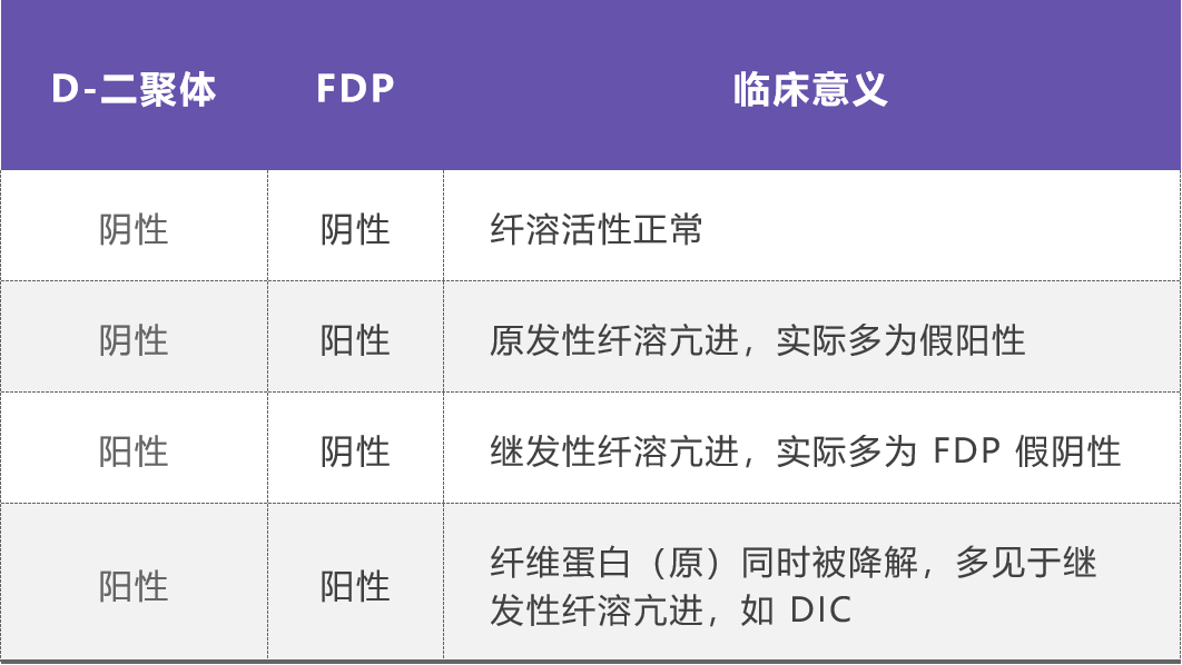 FDP 是纤维蛋白原的降解产物片段,体现着机体纤溶系统激活情况,即反映原发性纤溶亢进也反映继发性纤溶亢进。D-二聚体和 FDP 检测可作为纤溶系统活性的筛查试验,由于纤溶过度所致的出血多数是由原发性或继发性原因所引起,其检测结果分析见下表: