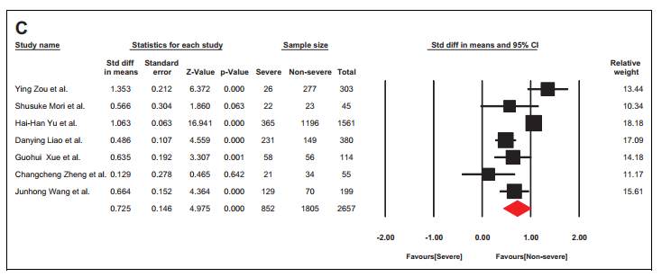 图 3 非重症、重症 COVID-19 患者 D-二聚体和 FDP 水平差异的森林图