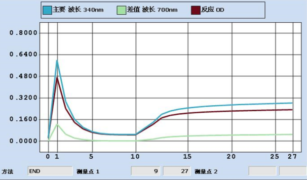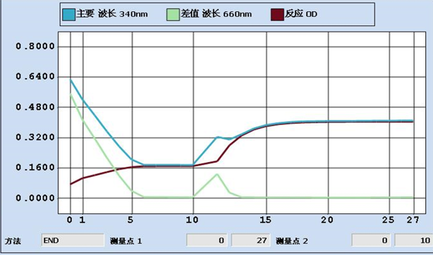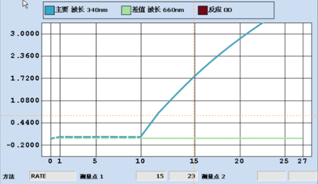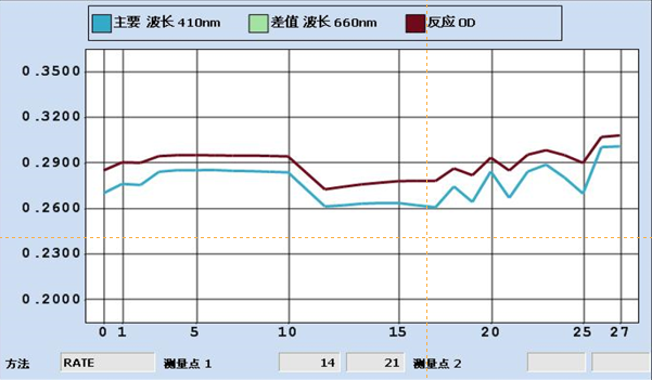 这一点在速率法项目上表现尤为明显。如上所述,速率法是需要在线性期通过检测测量点之间呈线性反应区间内吸光度变化速度的,如果光源不稳定,导致反应曲线出现波动,仪器检测不到呈线性反应的区间,自然无法计算出结果。